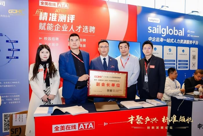 1月8日,全美在线(ATA)应邀出席 “才聚产兴・标准领航”创新发展论坛。本次论坛在粤港澳大湾区核心城市广州隆重举行,论坛紧扣国家高质量发展战略脉搏,深度响应《人力资源服务业创新发展行动计划(2023-2025 年)》《贯彻实施〈国家标准化发展纲要〉行动计划(2024—2025 年)》等政策要求,聚焦新质生产力培育与人力资源服务业转型升级的核心命题,成为行业政策落地、创新实践交流的重要载体。活动由中国国际商会商业行业商会人力资源管理委员会、广东省人力资源管理协会、广东省人力资源标准化技术委员会等单位联合主办,汇聚粤港澳大湾区及全国的行业专家、企业代表,搭建起政策解读、经验分享、资源对接的高端平台,为破解人才供需错配、推动行业标准化建设注入强劲动力。在会议上全美在线(ATA)通过主题展台、授牌仪式及专家授勋等多个环节,全面展示了其在人才评价领域的先进理念、技术实力与行业引领作用。