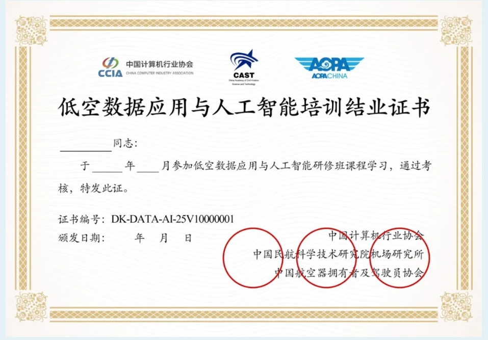 在低空经济加速落地的当下,行业最缺的是 “懂技术、通标准、能实战” 的复合型人才,而一张由权威机构认证的证书,正是专业能力的最强证明。本次研修班的结业证书,由三大机构联合颁发:中国计算机行业协会——国内计算机领域最具影响力的行业组织,主导多项数据领域标准制定;中国民航科学技术研究院机场研究所——民航领域政策研究与标准制定的核心机构,深耕低空基建与安全规范;中国航空器拥有者及驾驶员协会(AOPA)——低空飞行与无人机管理的权威机构,掌握行业准入与人才评价标准。
